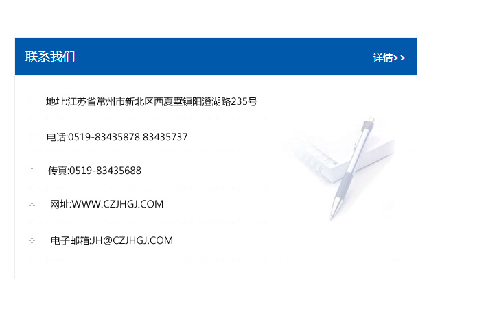 地址:常州市新北區友邦商務大廈1幢16、17層  電話:0519-85101652  傳真:0519-85112595  郵編:213022  網址:www.cz-jiayue_cn.heehui.com  郵箱:xiajifengaa@163.com